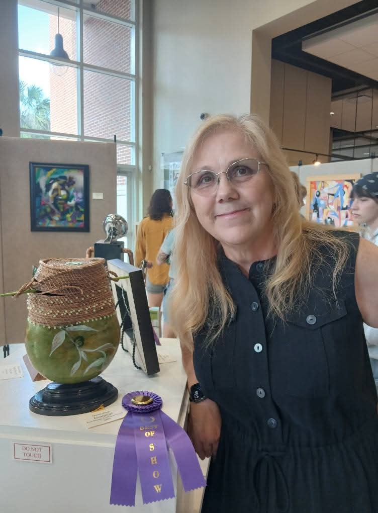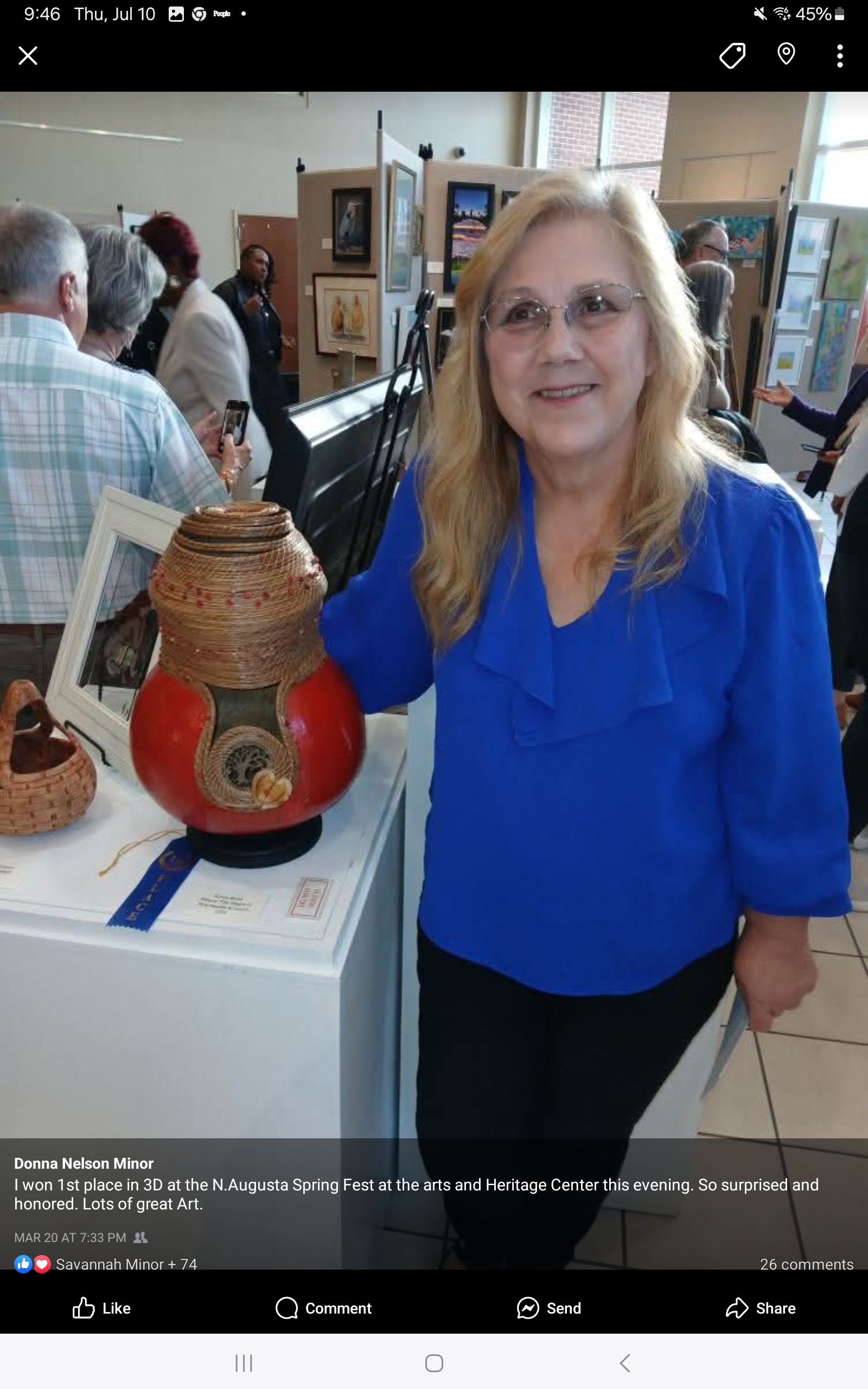 Donna Nelson Minor grew up in Greenville, S.C. She graduated High School in 1986 and then attended North Greenville College as an Art Major. Donna moved to Aiken in 1991. After many years of being out of the art scene, in 2009, she joined the Art Association of Ridge Spring and served as Secretary for several years. She learned pine needle coiling from an artist friend and it has become her signature style. Donna began competing as an artist in 2011 and has been successful in several shows every year. “I have always loved and appreciated art from a very early age. I feel that even after many years, there is still so much to learn and there is always room to grow.” 2025 has been a very successful year. I made the S.C. Festival of Flowers Show, AAG Show, N.A. Spring Show – 1st in 3-D, and N. Augusta Open Sessions Show- Best in Show.
